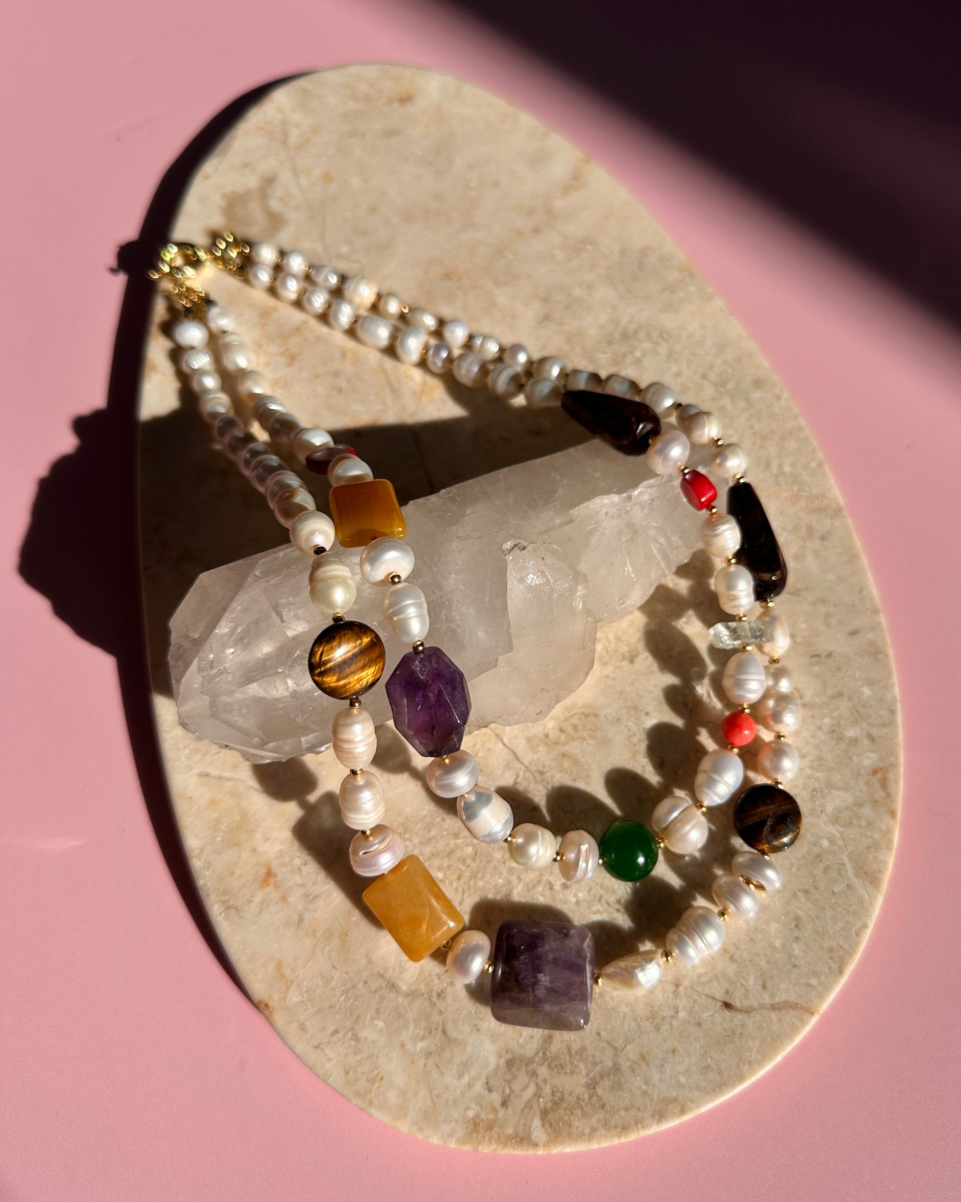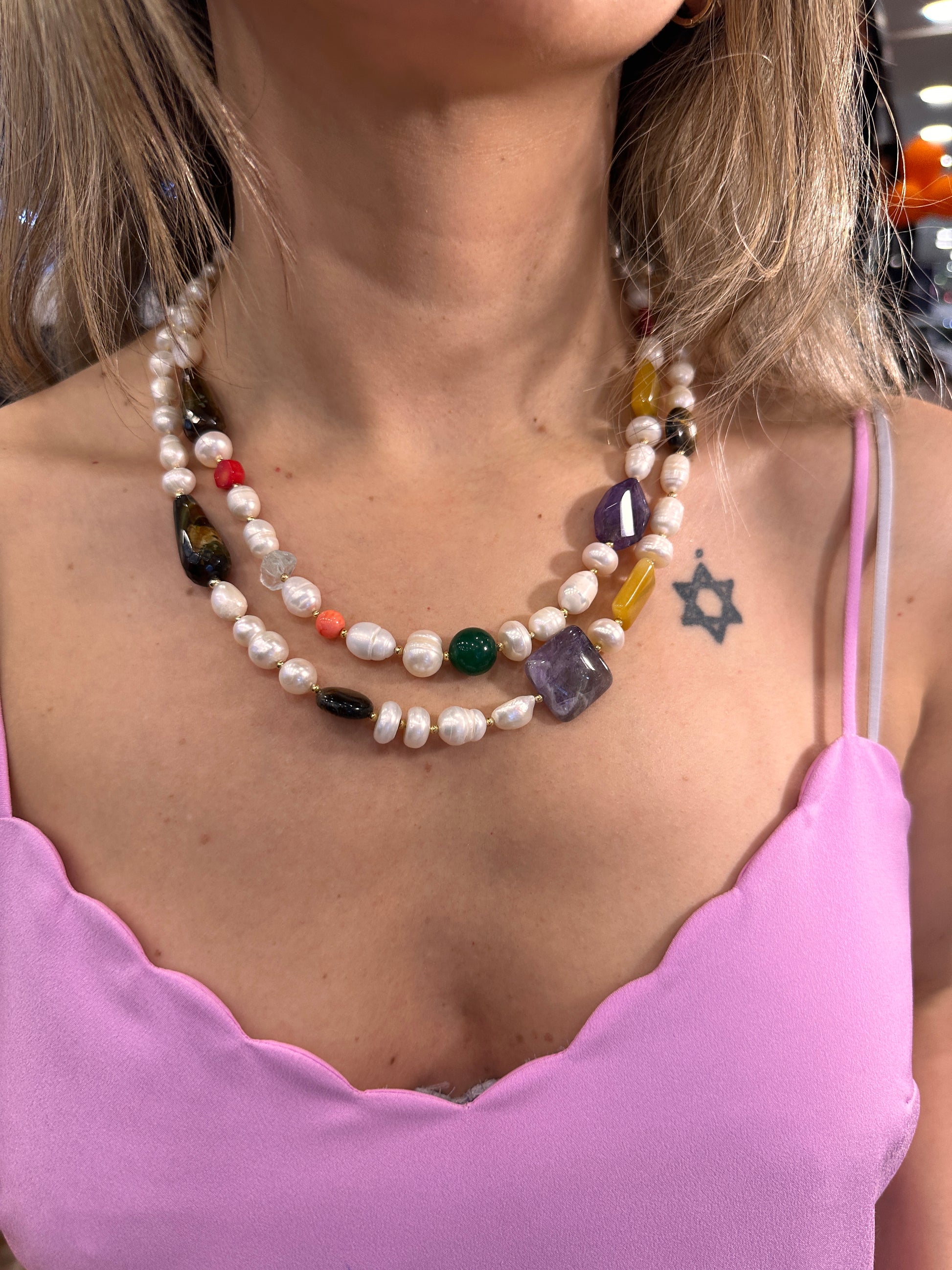 Collar Estrambótico de Perlas I, un collar potente y atrevido que promete atraer todas las miradas. Diseñado con Perlas de Río y piedras en distintos tipos y formas que rompen la estructura clásica de las perlas, creando un diseño único y expresivo. Su composición de doble cordón presenta un largo de 48 cm en el collar más corto y 55 cm en el más largo. Todos sus metales están enchapados en oro de 18k.