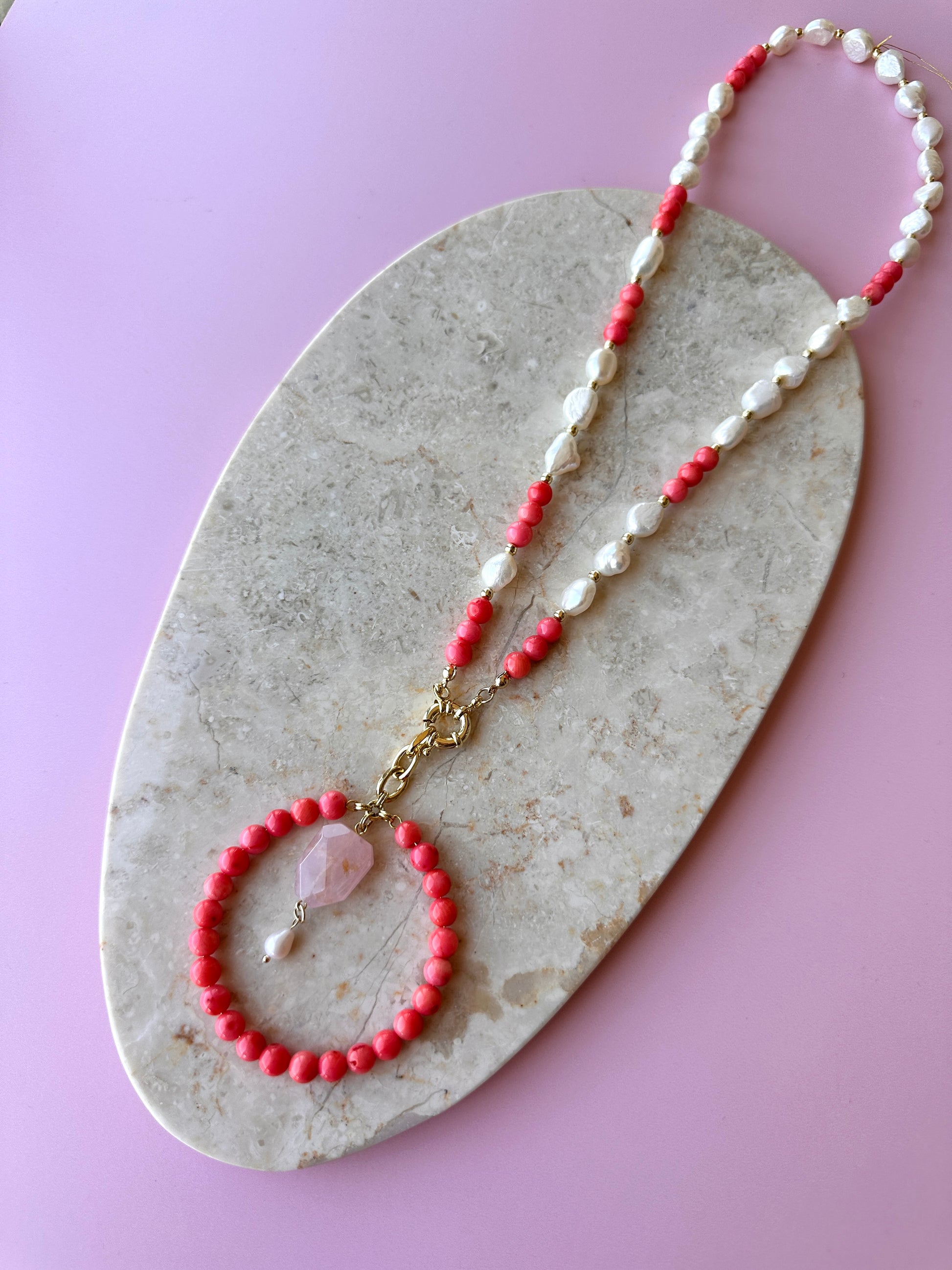 Nuestro Maravilloso Collar Rueda de perlas de río, Coral y Cuarzo rosa, es un diseño totalmente único y versátil, ya que puedes ocupar el cordón por separado y desprender la rueda, lo que permite múltiples usos. Su cordón de perlas y Coral con 61 cm. de largo.