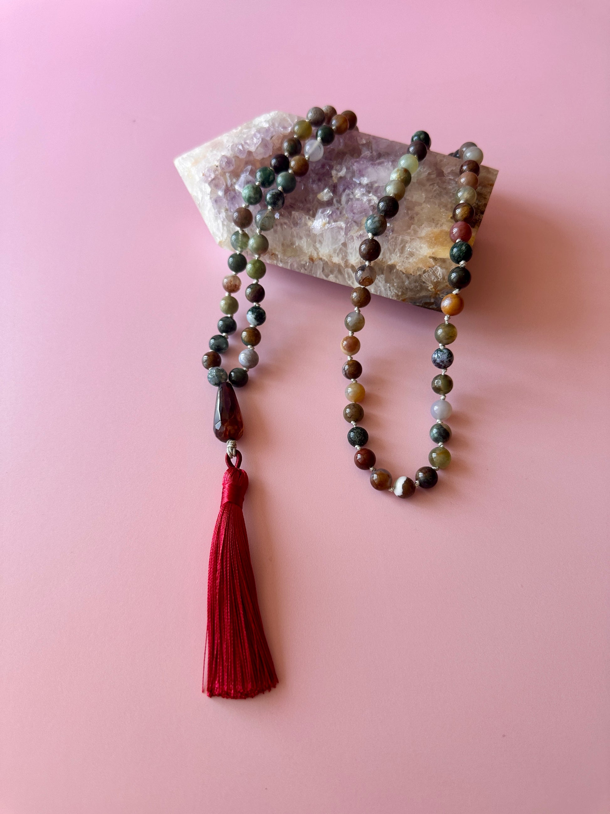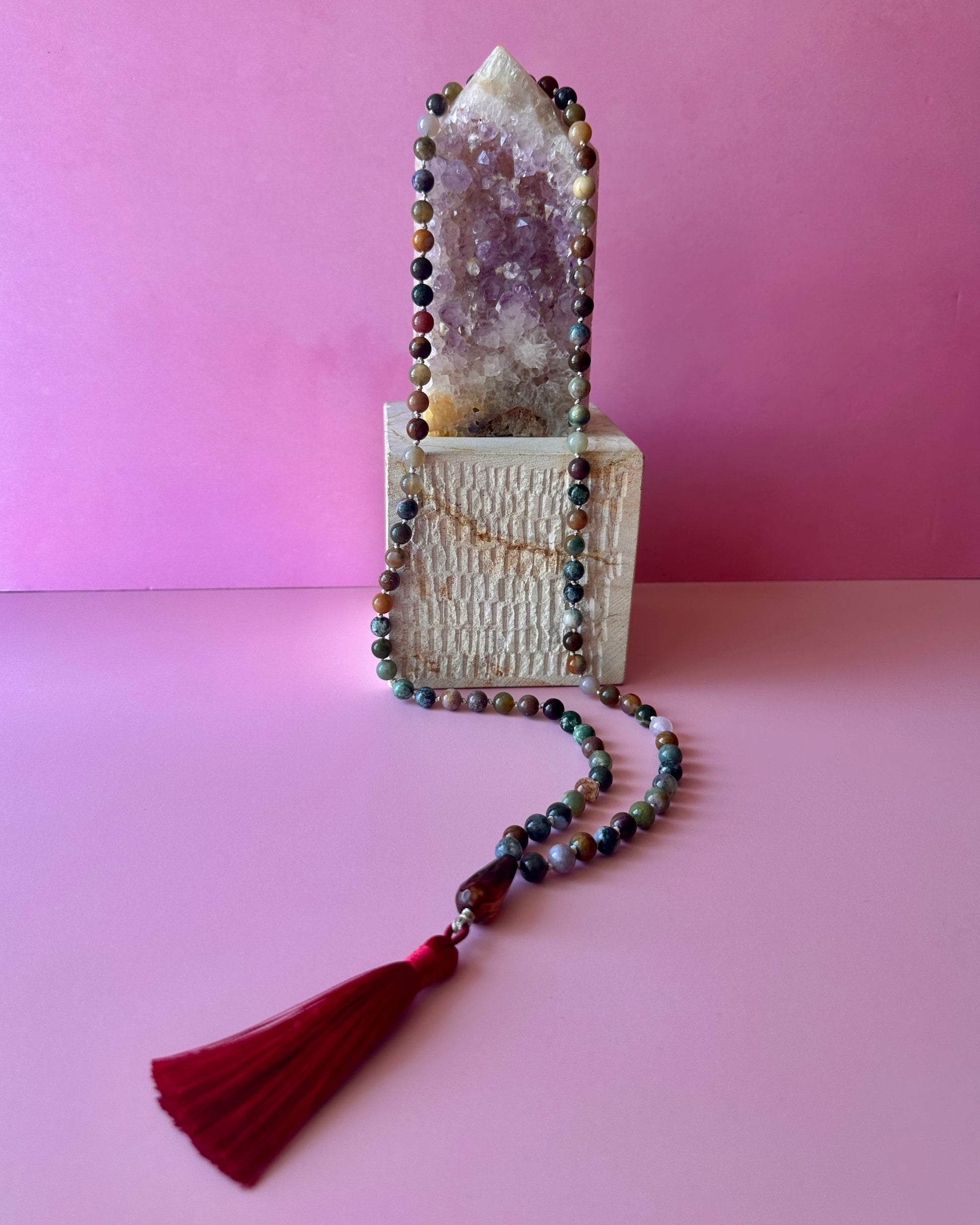 Collar Medicina, diseñado con Ágata India, reconocida por su acción sanadora y equilibrante. Con un largo de 84 cm, esta pieza finaliza con una lágrima de Ágata en tono café y una borla de seda en color burdeo. Este collar forma parte de la colección "Collares Medicina", creada exclusivamente con piedras naturales concebidas como canal energético.