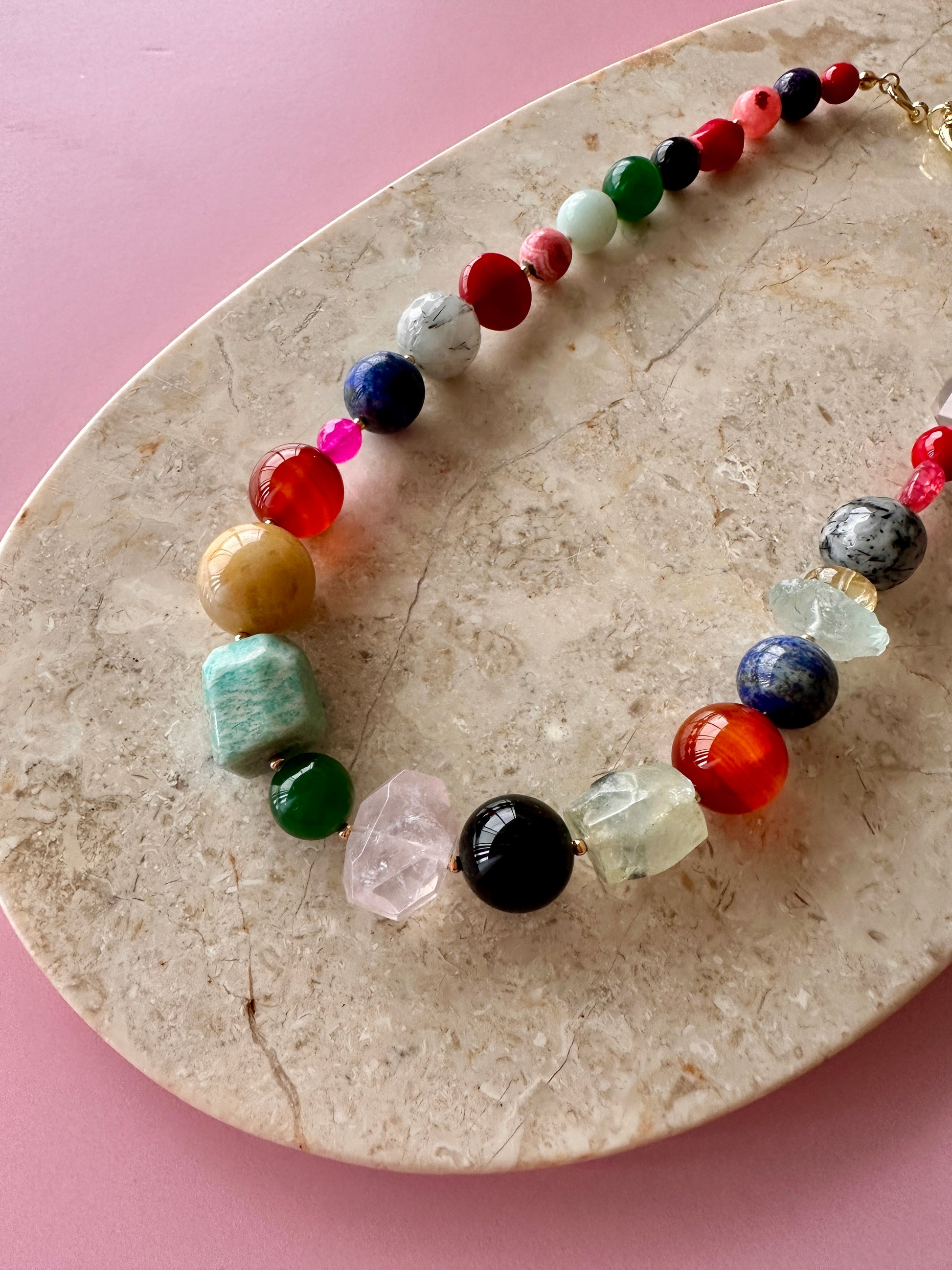 MaxiCollar Alegría, un collar que pertenece a la colección “Maxi”, donde el volumen y el atrevimiento en los diseños son esenciales. Esta pieza es una verdadera celebración del color, la diversidad y la energía vital, pensada para expresar alegría sin filtros, movimiento y una actitud lúdica frente a la vida. Un diseño vibrante, poderoso y libre, que no pasa desapercibido y contagia entusiasmo. Con una longitud de 48 cm, es un manifiesto de expresión personal y goce.