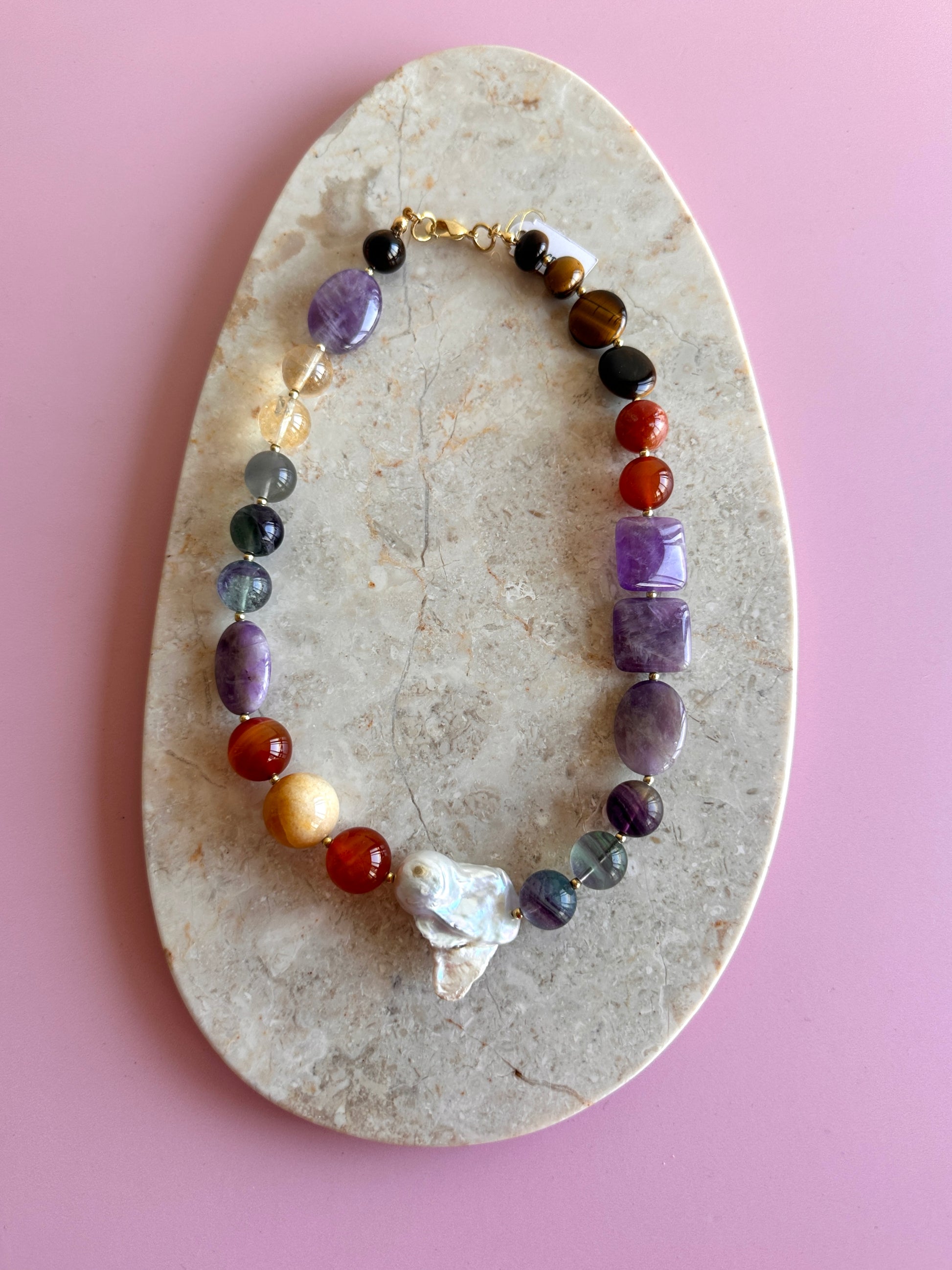 MaxiCollar Barroca Asimétrico, un collar que pertenece a la colección “Maxi”, donde el volumen y el atrevimiento en los diseños son esenciales. Este diseño en particular destaca una Perla de Río barroca en su centro, acompañada por una estructura de piedras dispuesta de forma asimétrica, lo que le otorga un carácter orgánico y contemporáneo. Con una longitud de 48 cm, esta pieza cuenta con todos sus metales enchapados en oro de 18k.
