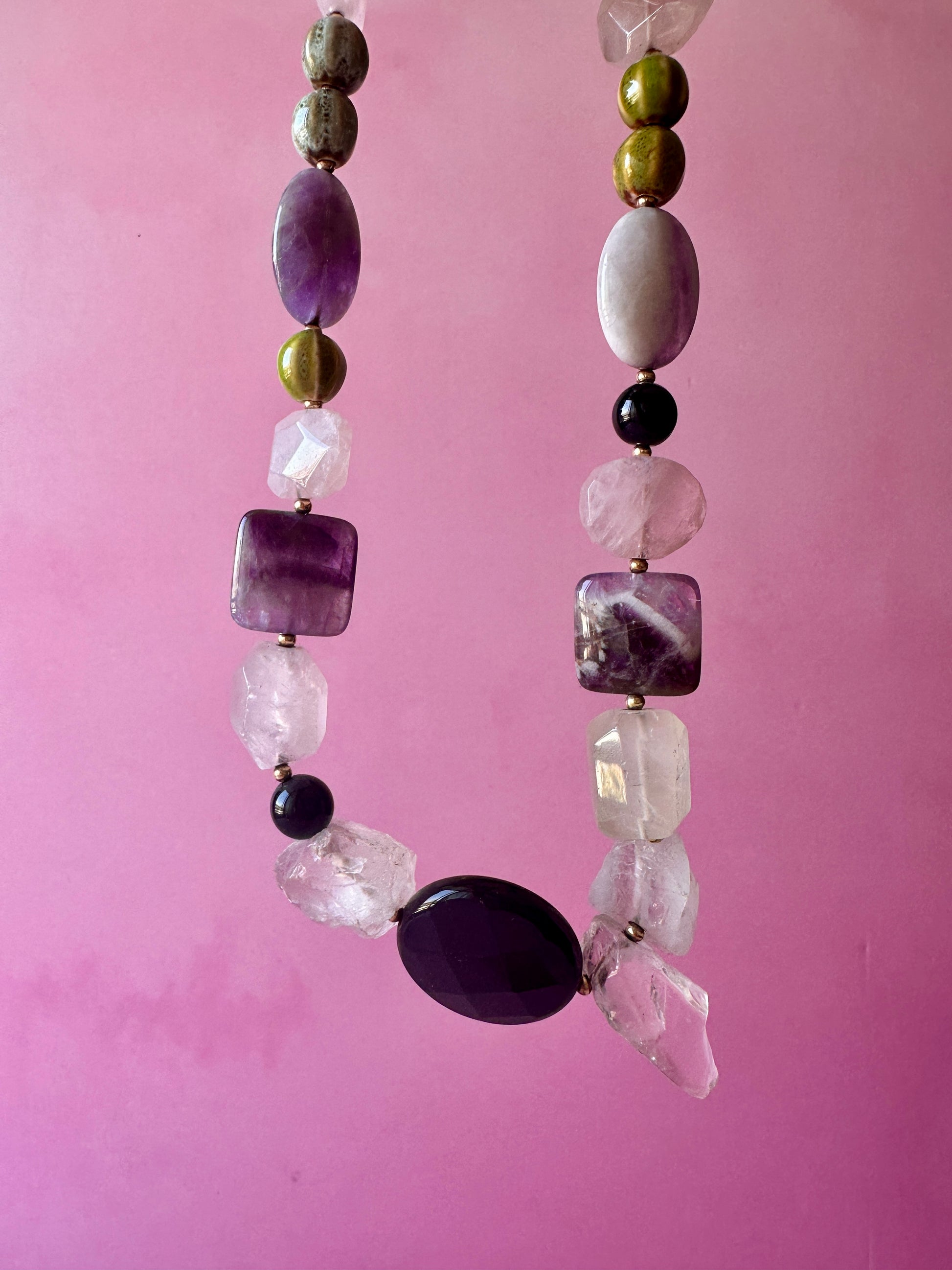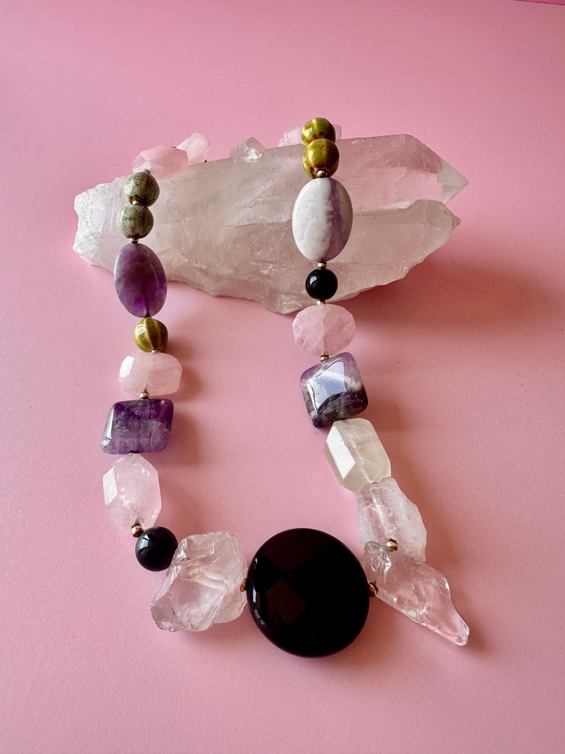 MaxiCollar Estrafalario, un collar de la colección "Maxi" diseñado con una combinación de piedras naturales y algunas cuentas de loza que aportan un toque distintivo y poco convencional. Con un largo de 45 cm, esta pieza destaca por su composición libre y expresiva. Un collar de diseño estrafalario, fiel a su nombre, creado para alguien diferente, que no está enfocado en seguir reglas y elige manifestar su identidad desde lo auténtico.