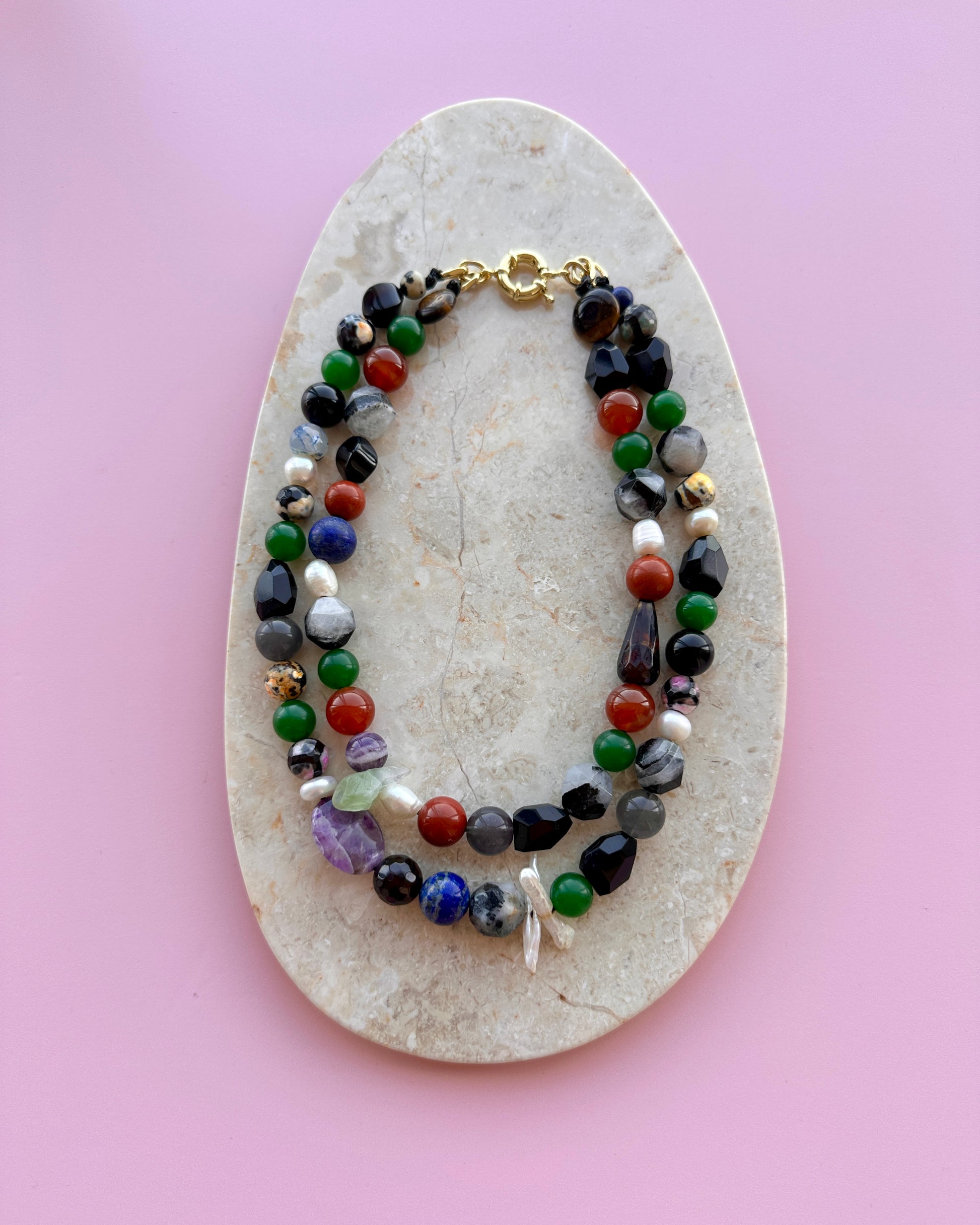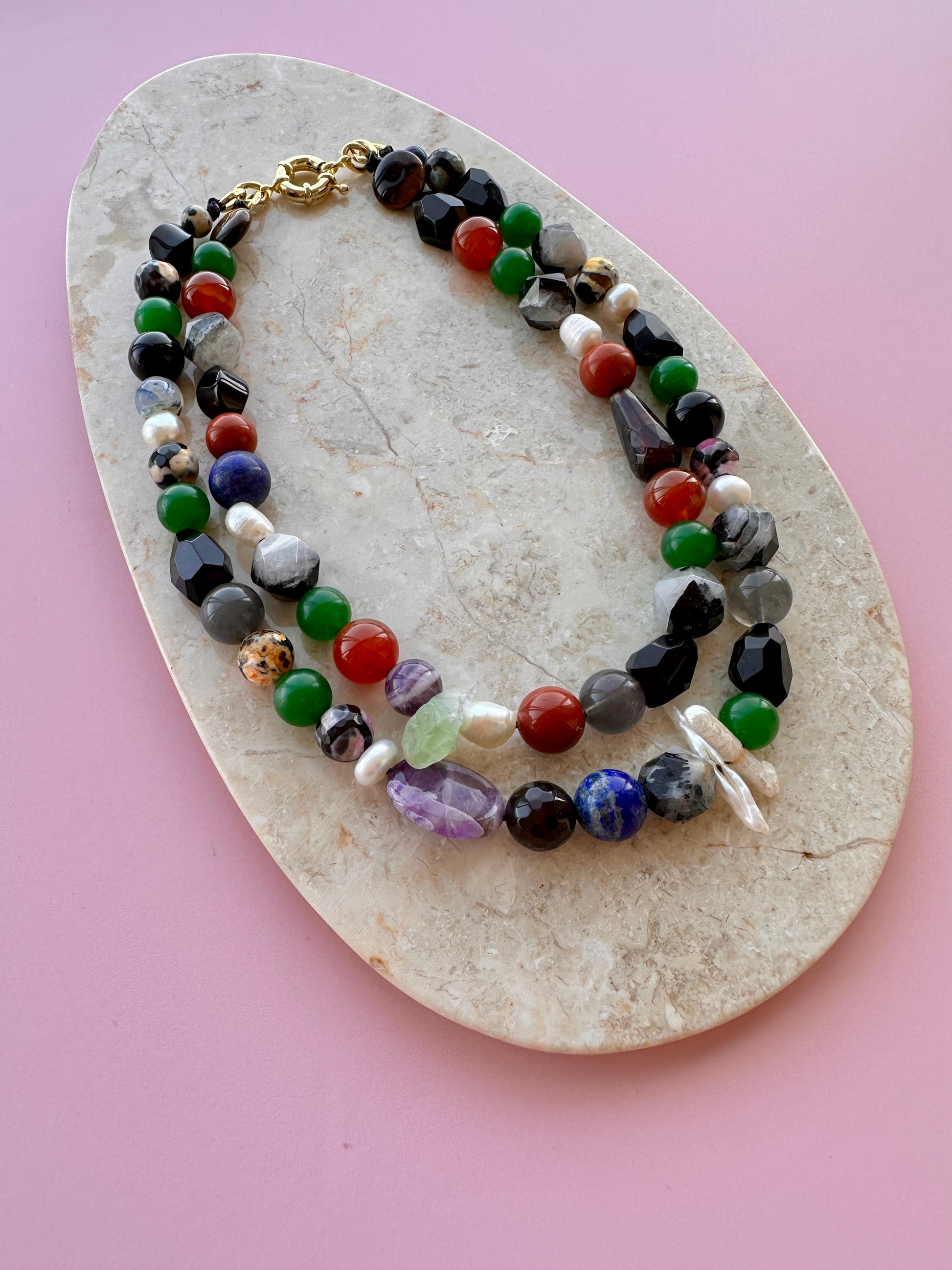 MaxiCollar Estrambótico Multipiedras, un collar extraordinario y alucinante. Esta pieza pertenece a la colección "Maxi", donde el volumen y el atrevimiento en los diseños son esenciales. En particular, destaca por ser uno de los más voluptuosos, con doble cordón y una mezcla de múltiples tipos de piedras junto a algunas Perlas de Río. La ausencia de separadores entre las cuentas de piedra le otorga un diseño más informal, libre y salvaje.