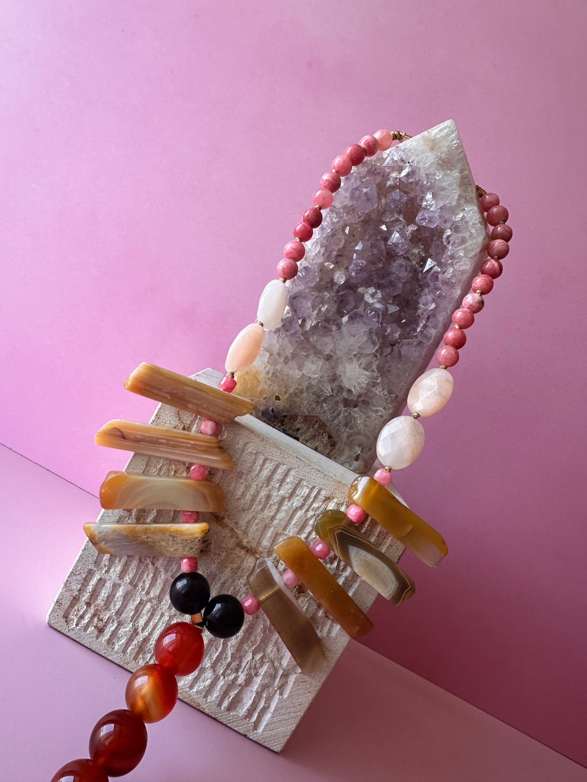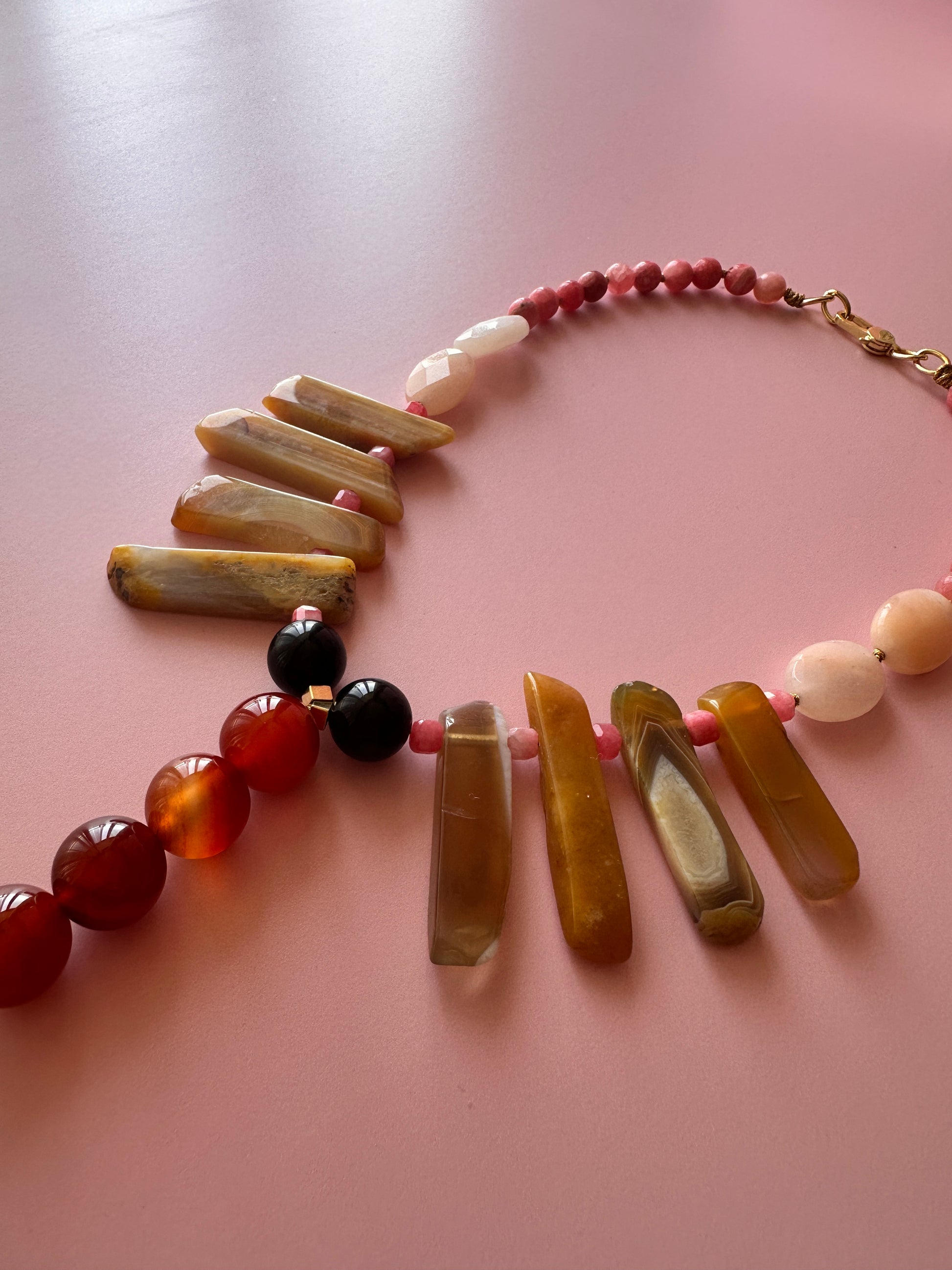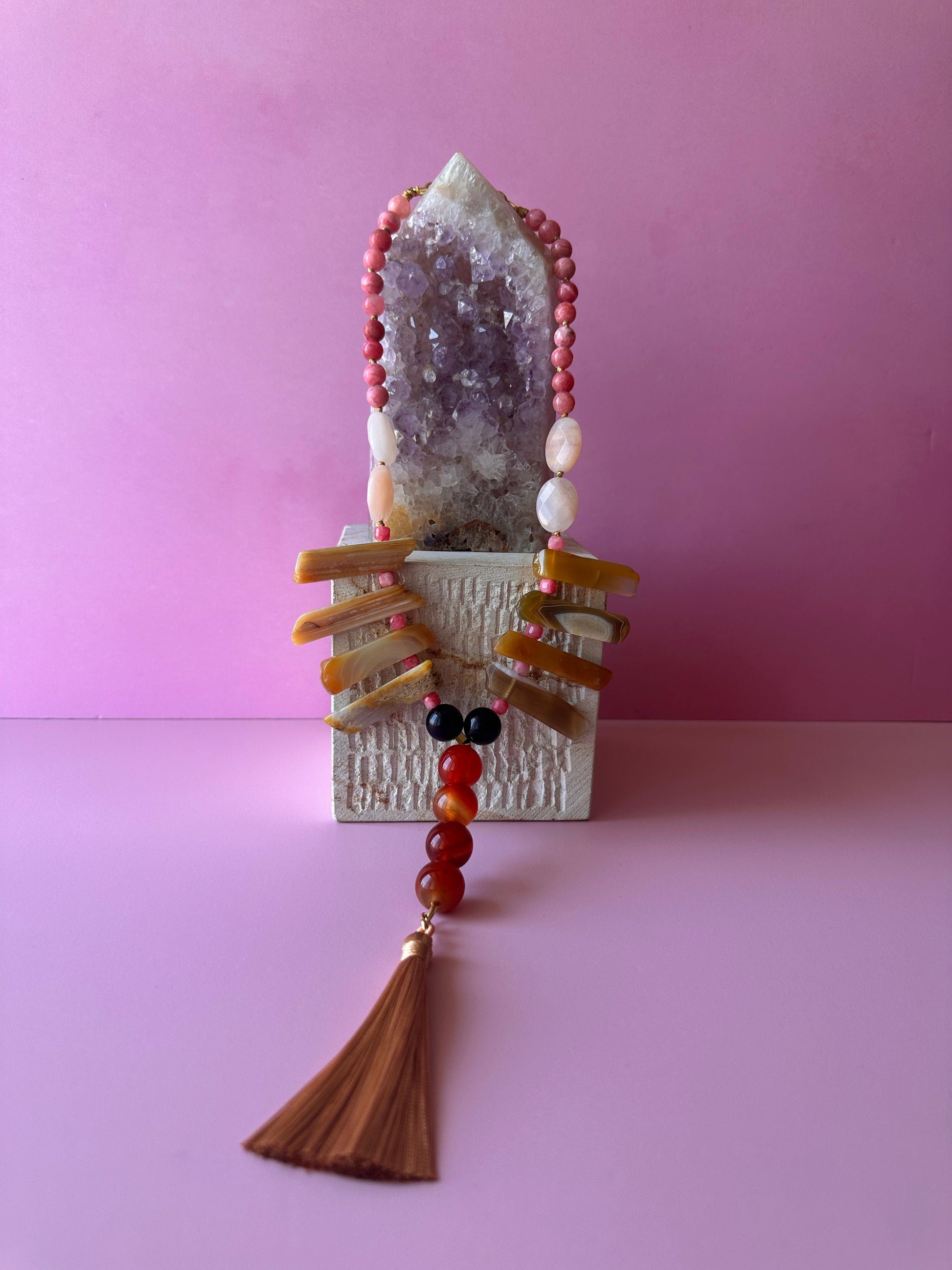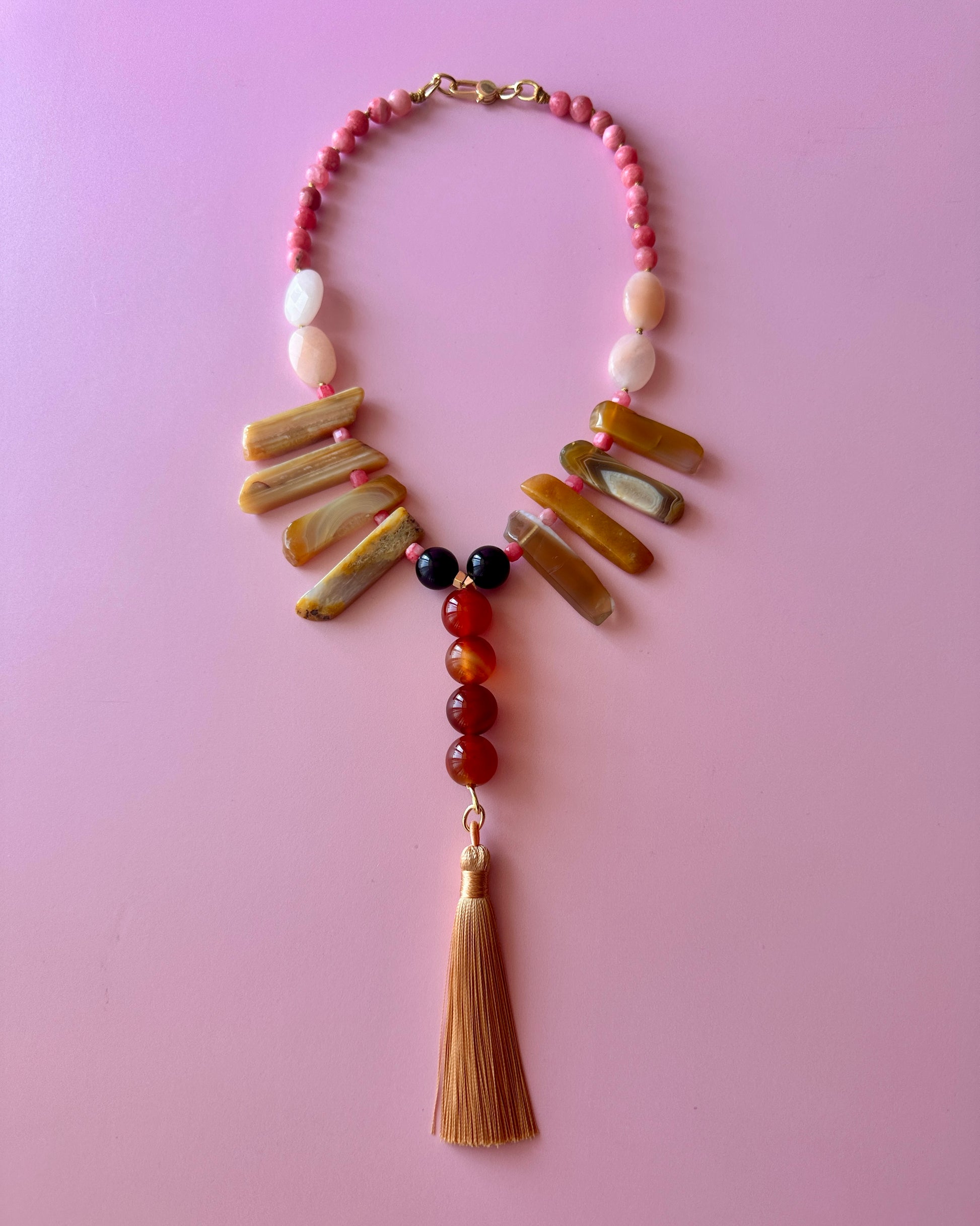 MaxiCollar Extravagante, un collar de alto impacto con un diseño audaz e imponente, inspirado en la joyería de tribus africanas. Con una longitud de 47 cm, sin considerar la parte central del collar, esta pieza destaca por sus Ágatas alargadas y asimétricas, Cornalinas de gran tamaño y una borla de seda en tono beige dorado que le otorga un aire de elegancia y distinción.