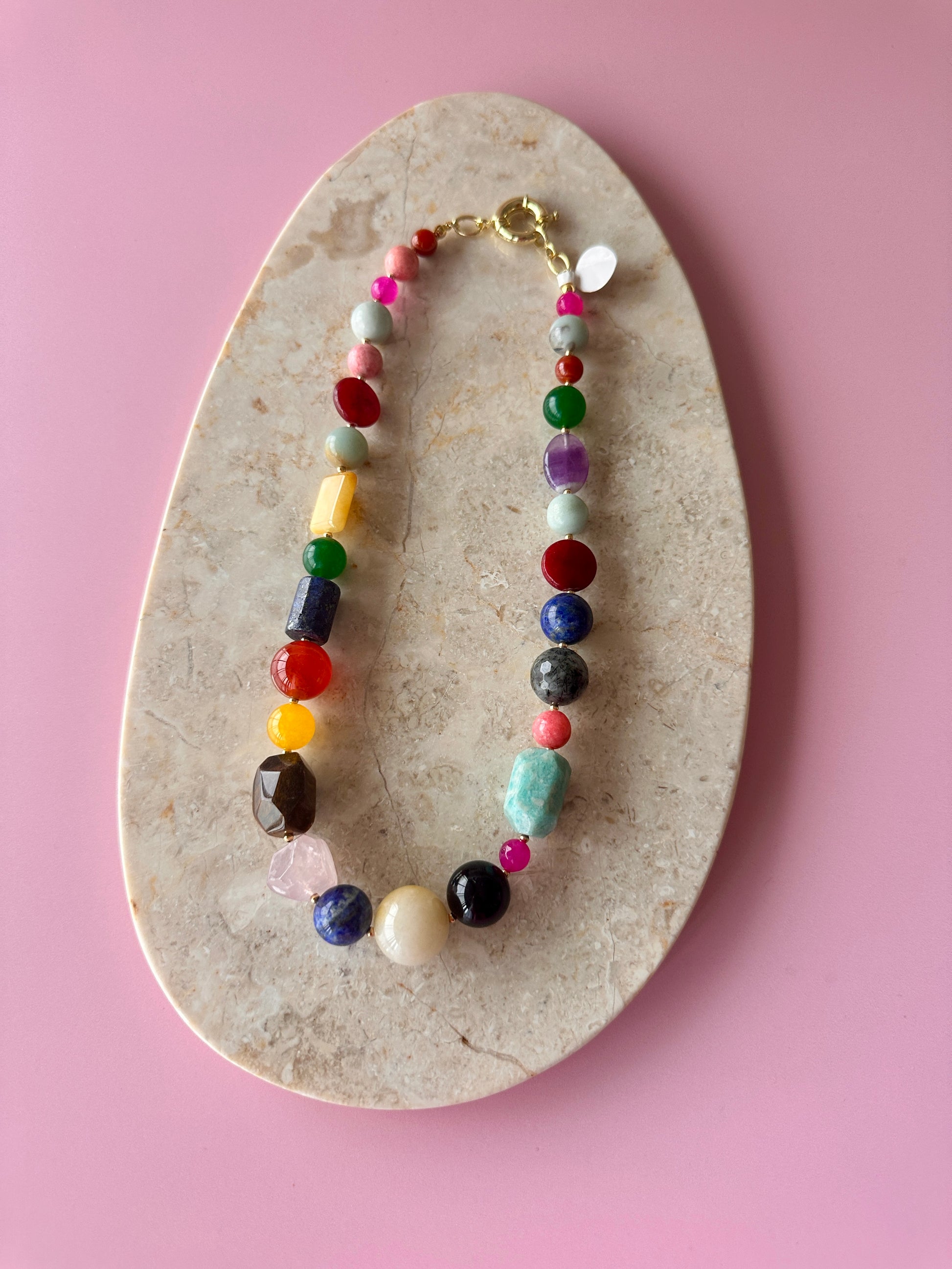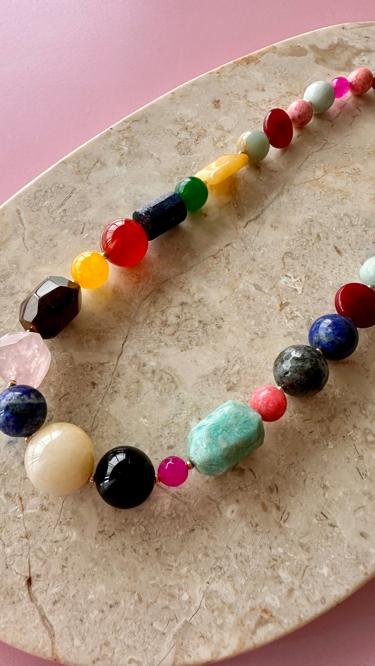MaxiCollar Fiesta, un collar de la colección "Maxi", donde el volumen y la variedad de piedras, en tipos, colores y formas, son la verdadera esencia. Con Piedras y enchape de oro 18K y 49 cm de longitud, esta pieza celebra la expresión libre, el movimiento y la alegría a través de su diseño, con propiedades de sanación y protección.
