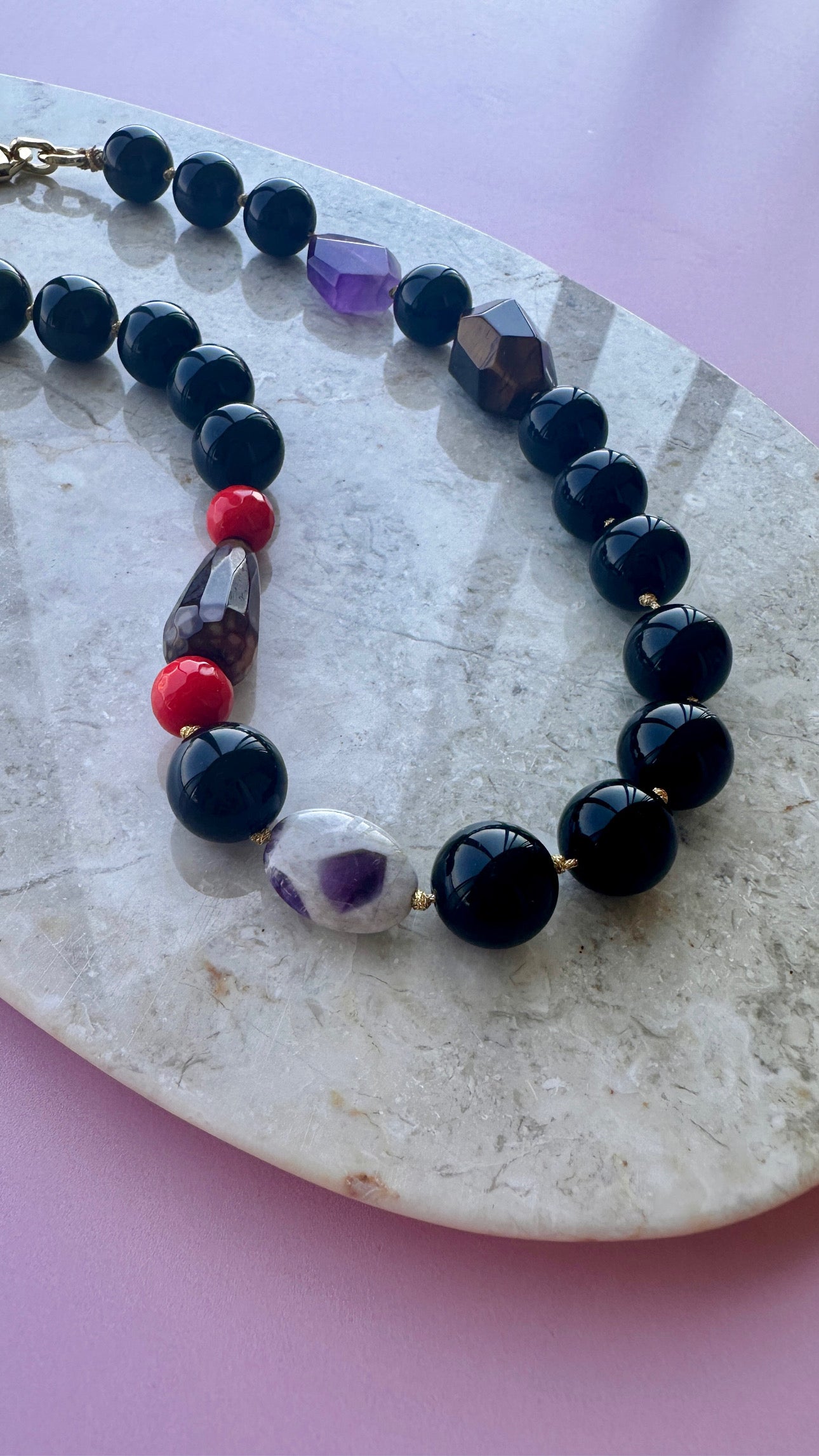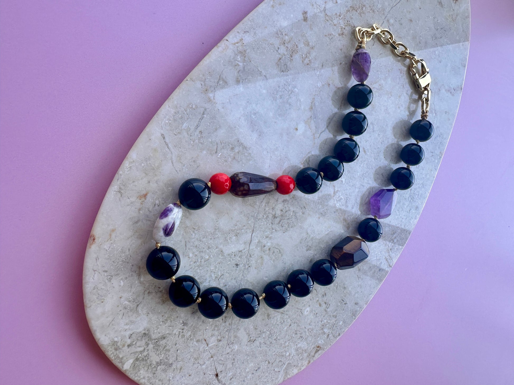MaxiCollar Protector, un collar de la colección "Maxi", con una longitud de 45 cm que, gracias a su extensión de cadena, permite ajustarlo hasta 50 cm de largo. Está diseñado con piedras de propiedades protectoras como Obsidianas y Ojo de Tigre, además de cualidades transmutadoras aportadas por la Amatista y un trabajo en el plano emocional dado por las Ágatas. Todos sus metales están enchapados en oro de 18k; sus tonos lo convierten en un accesorio elegante y sofisticado.