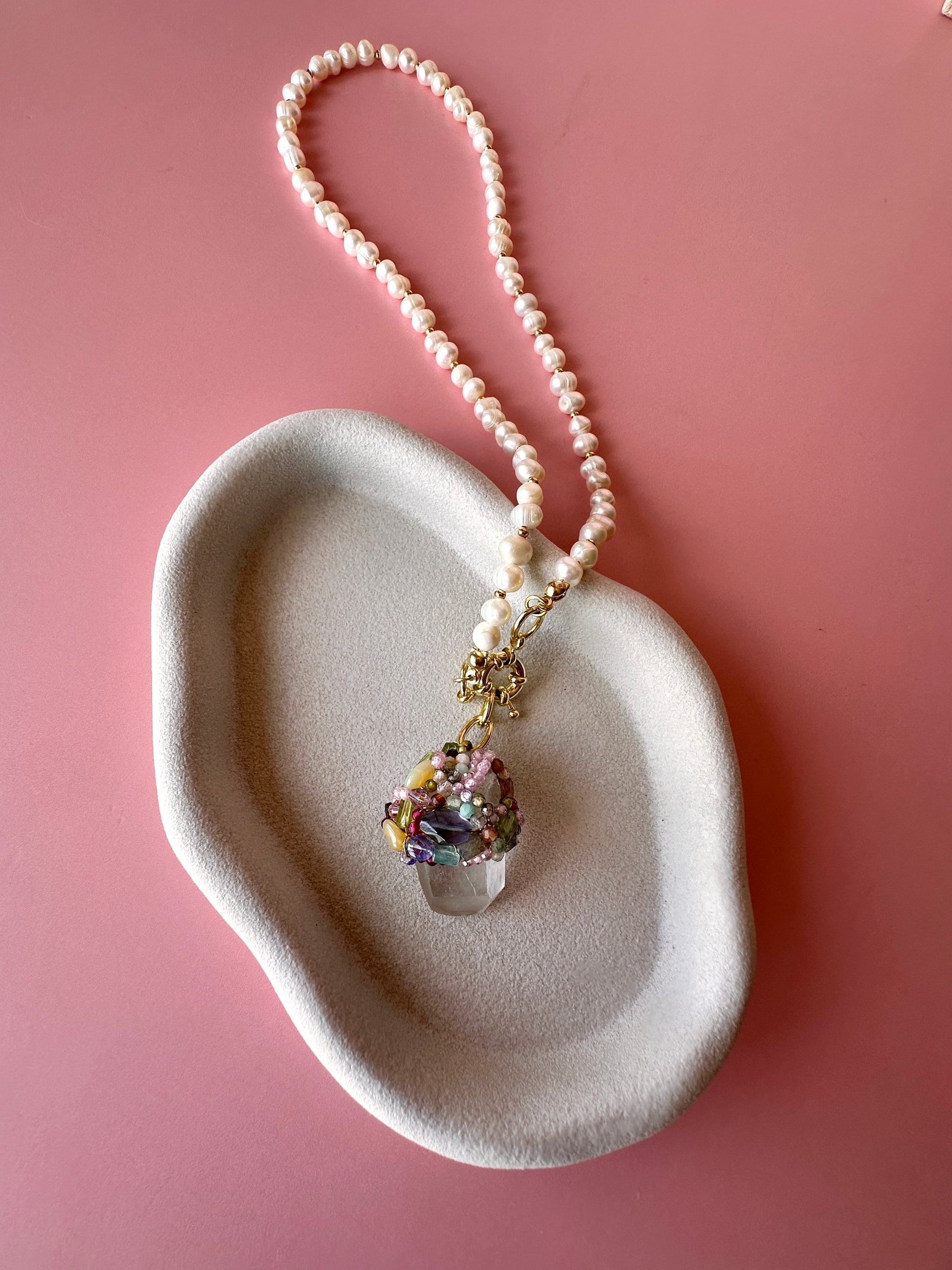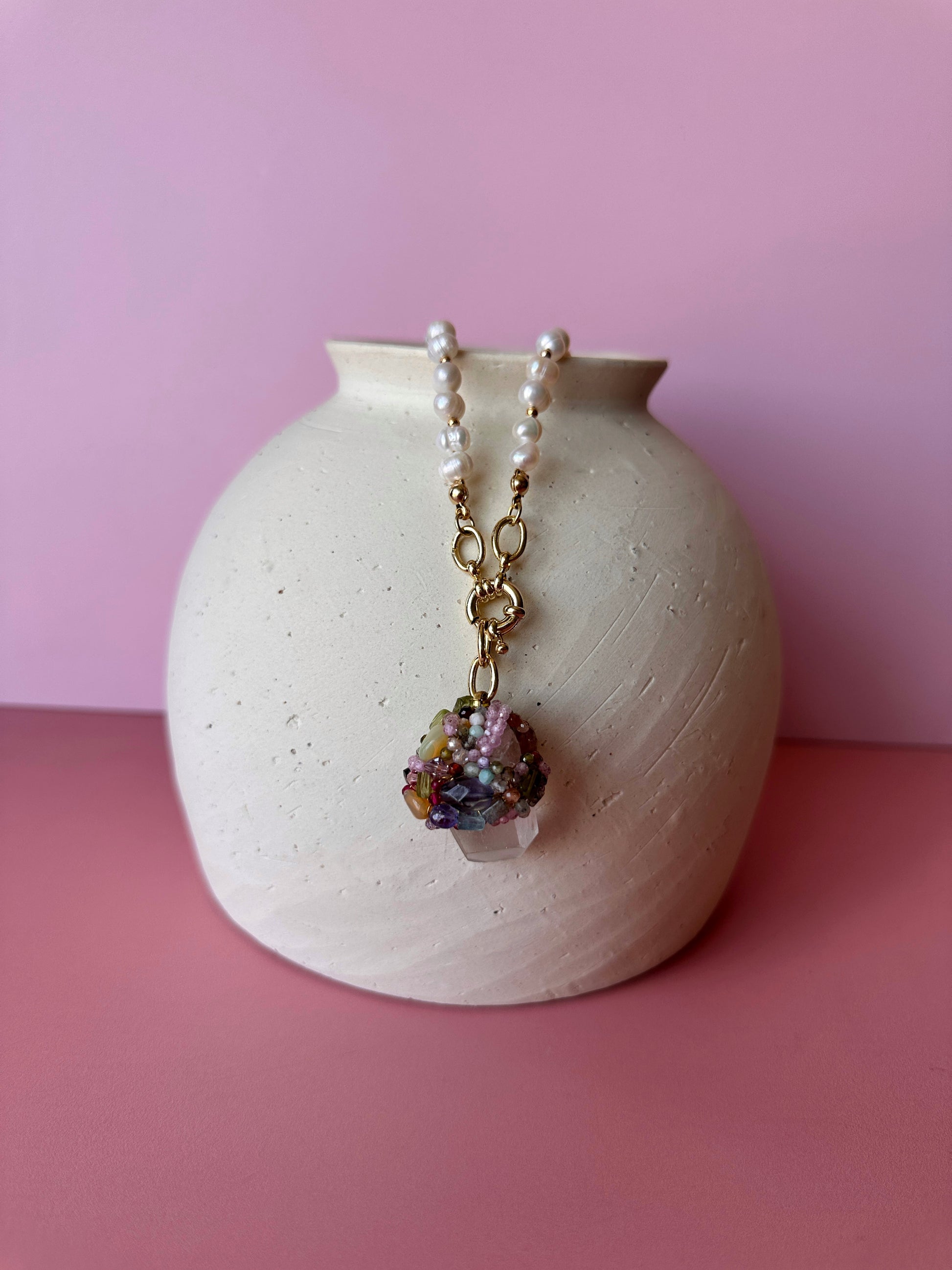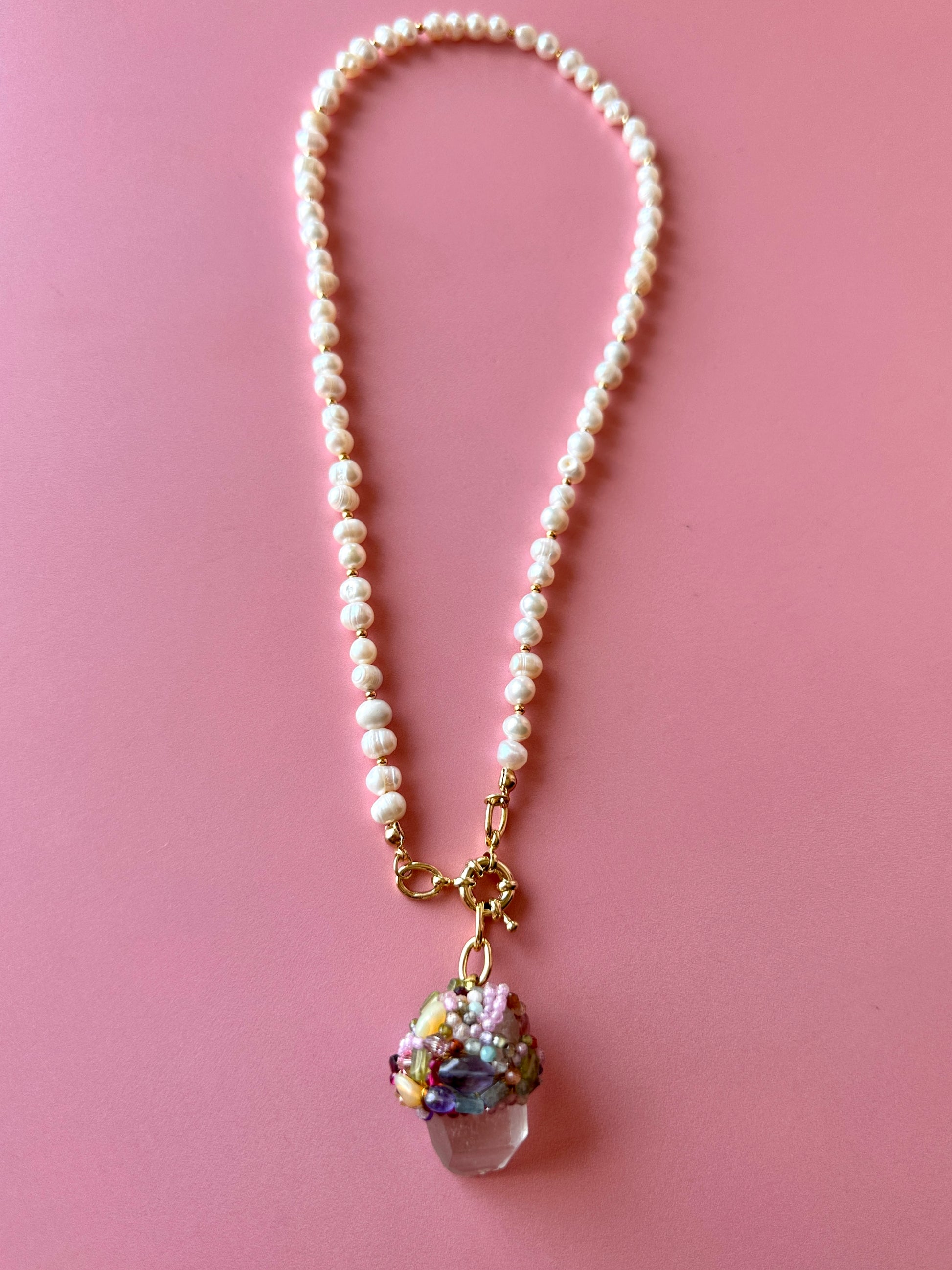 Mini Talismán Cuarzo 1, un collar cuyo protagonismo recae en un mágico y natural Cuarzo en bruto, decorado con piedras semipreciosas y cristales austriacos. Este accesorio se transforma en un verdadero aliado energético, acompañándote, cuidándote y ayudando en procesos de sanación, ya que los Cuarzos en bruto poseen poderosas propiedades protectoras. El talismán incluye un cordón de Perlas de Río de 50 cm de longitud y un broche timón frontal, permitiendo usarlo en conjunto o por separado. Todos sus metales están enchapados en oro de 18k.