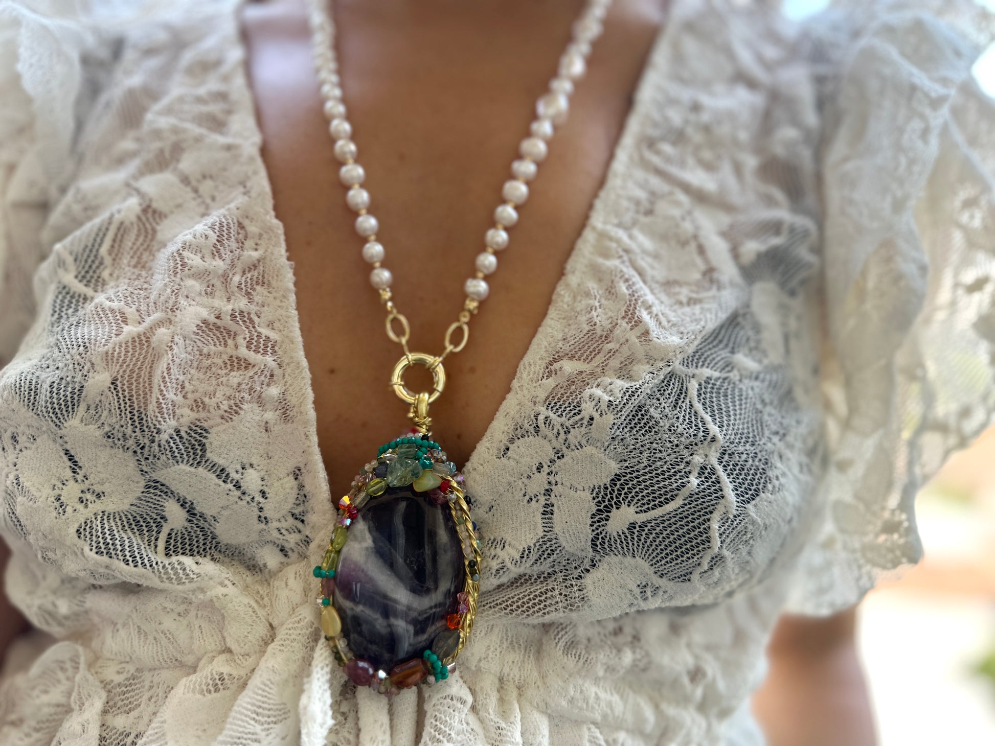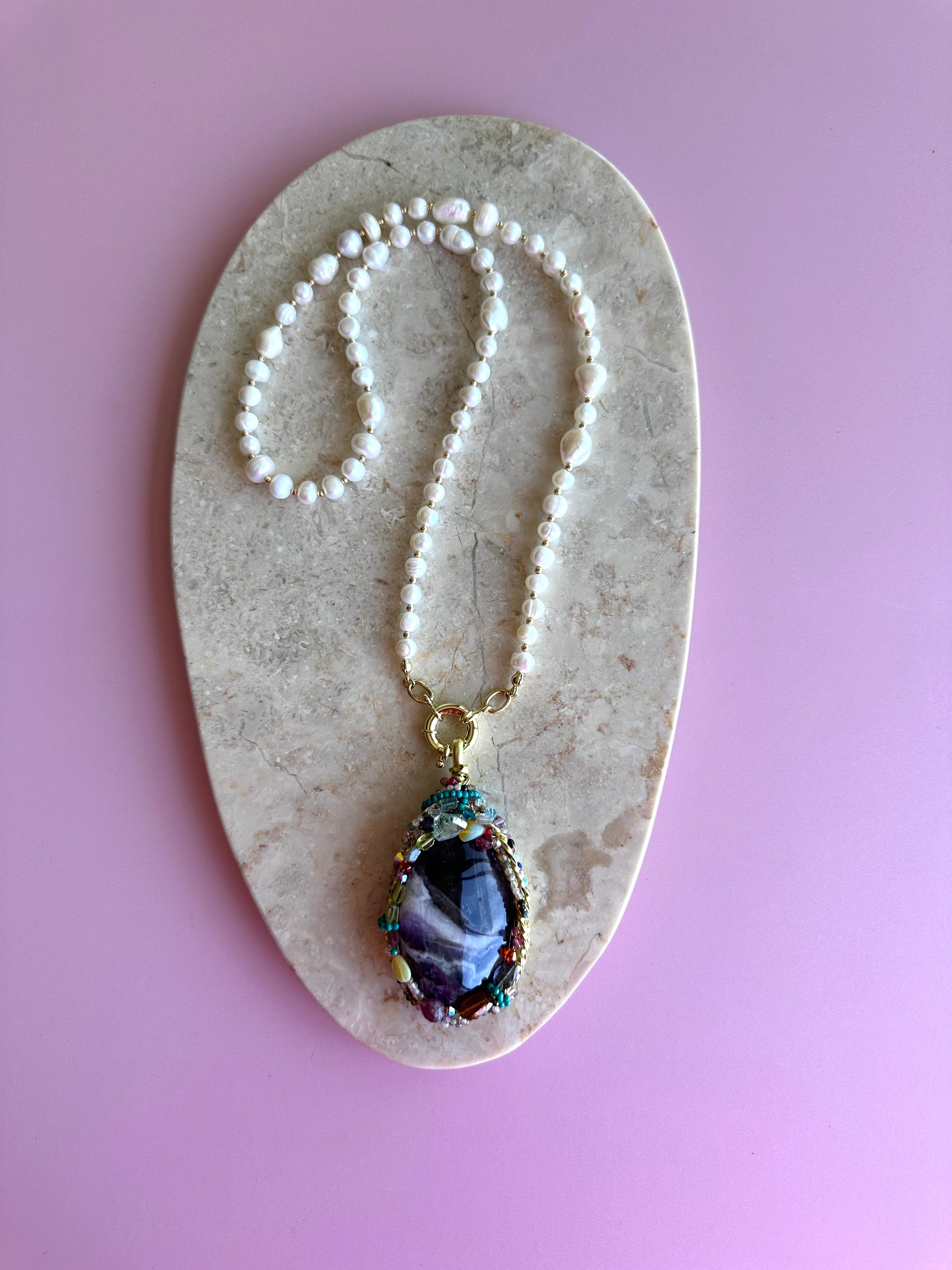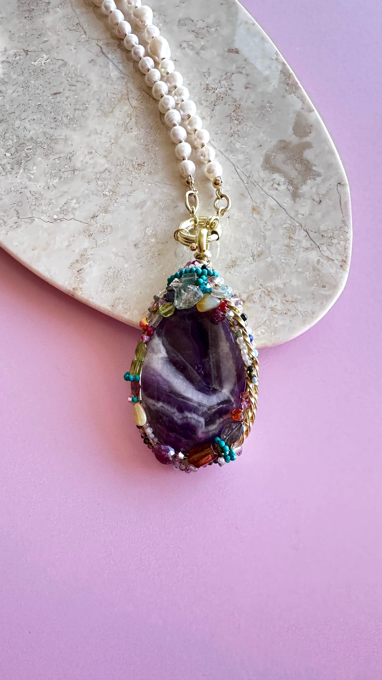 Collar Talismán de Amatista Transmutadora, una pieza única e irrepetible. Esta majestuosa Amatista natural, con sus hipnóticas vetas púrpuras, está delicadamente engarzada con piedras multicolores y un cordón de perlas de río de 60 cm. (Versátil, que puedes usar por separado gracias a su broche timón).