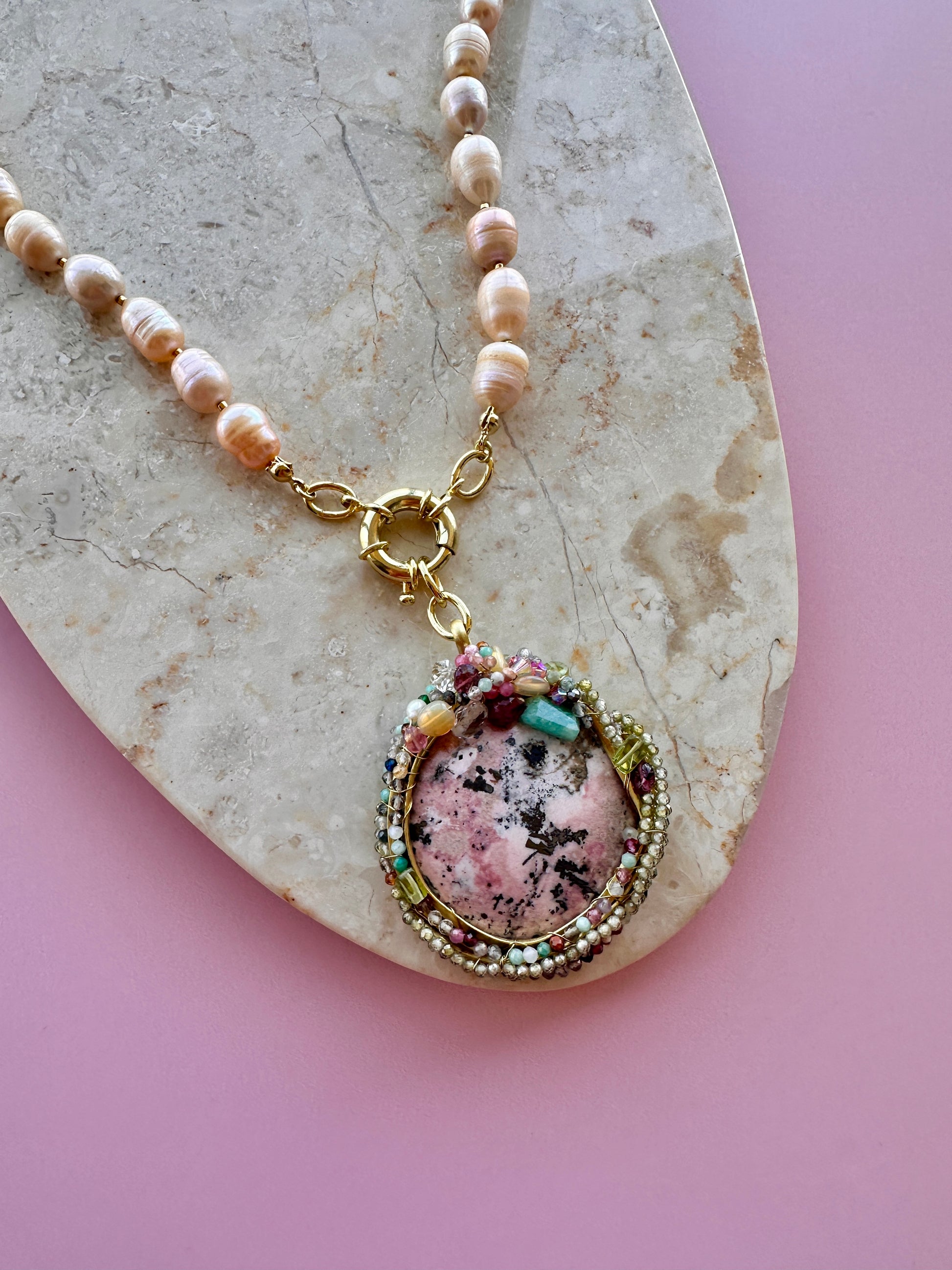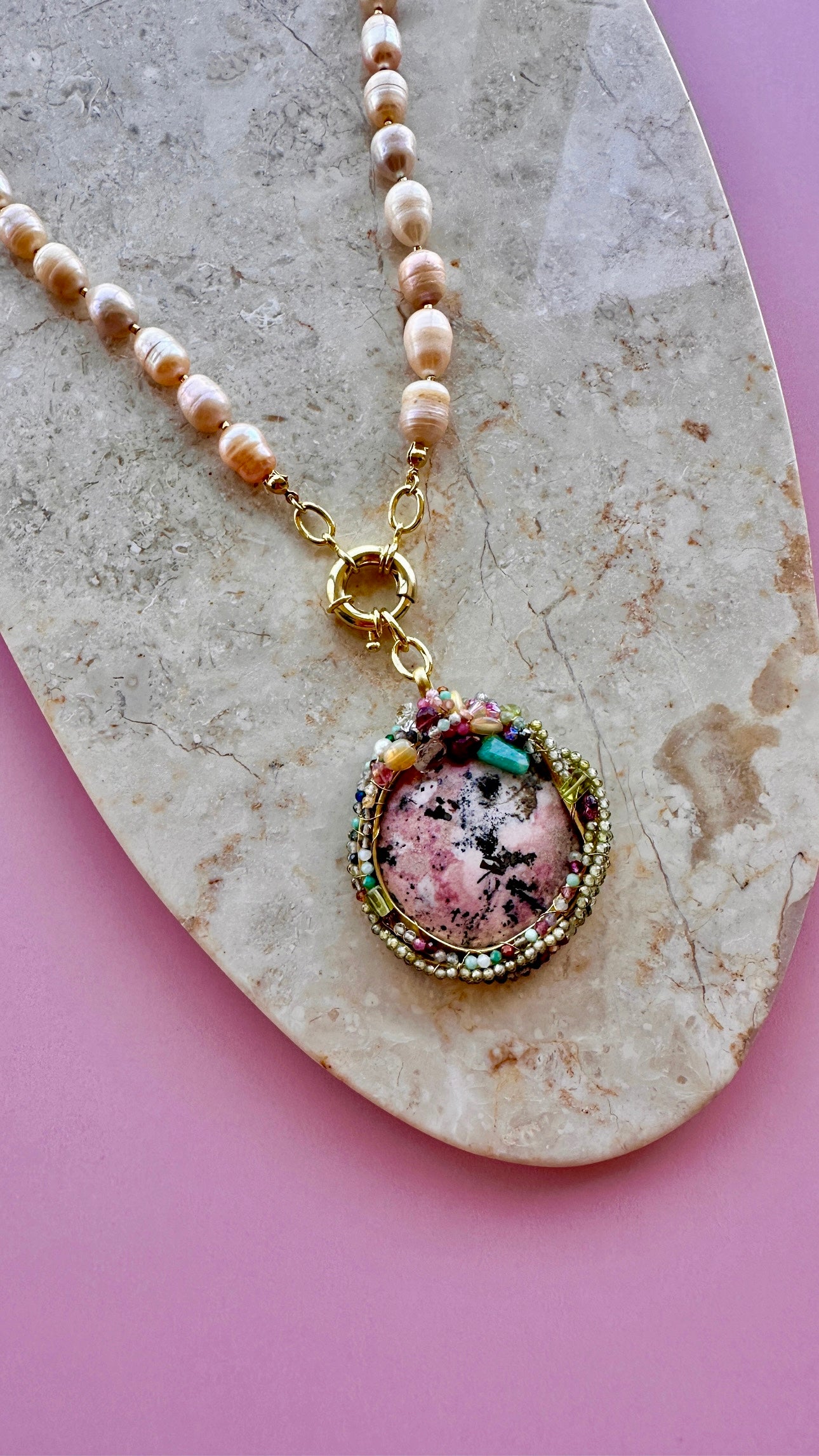 Talismán Amplificador de Bienestar, un collar diseñado a partir de una Rodocrosita, mineral profundamente femenino y magnético, reconocido por amplificar el bienestar y las cualidades positivas del corazón. Esta piedra acompaña procesos de apertura emocional, amor propio y expansión interna, además de impulsar a salir de la zona de confort, atravesar miedos y animarse a transitar aquellos caminos que el alma anhela desde lo profundo. El talismán incluye un cordón de Perlas de Río en un delicado tono beige rosado, con perlas irregulares y suaves tornasoles. Su broche timón en la parte frontal permite usarlo en conjunto o por separado, adaptándose a distintas intenciones y momentos. Todos los metales del cordón están enchapados en oro de 18k.
