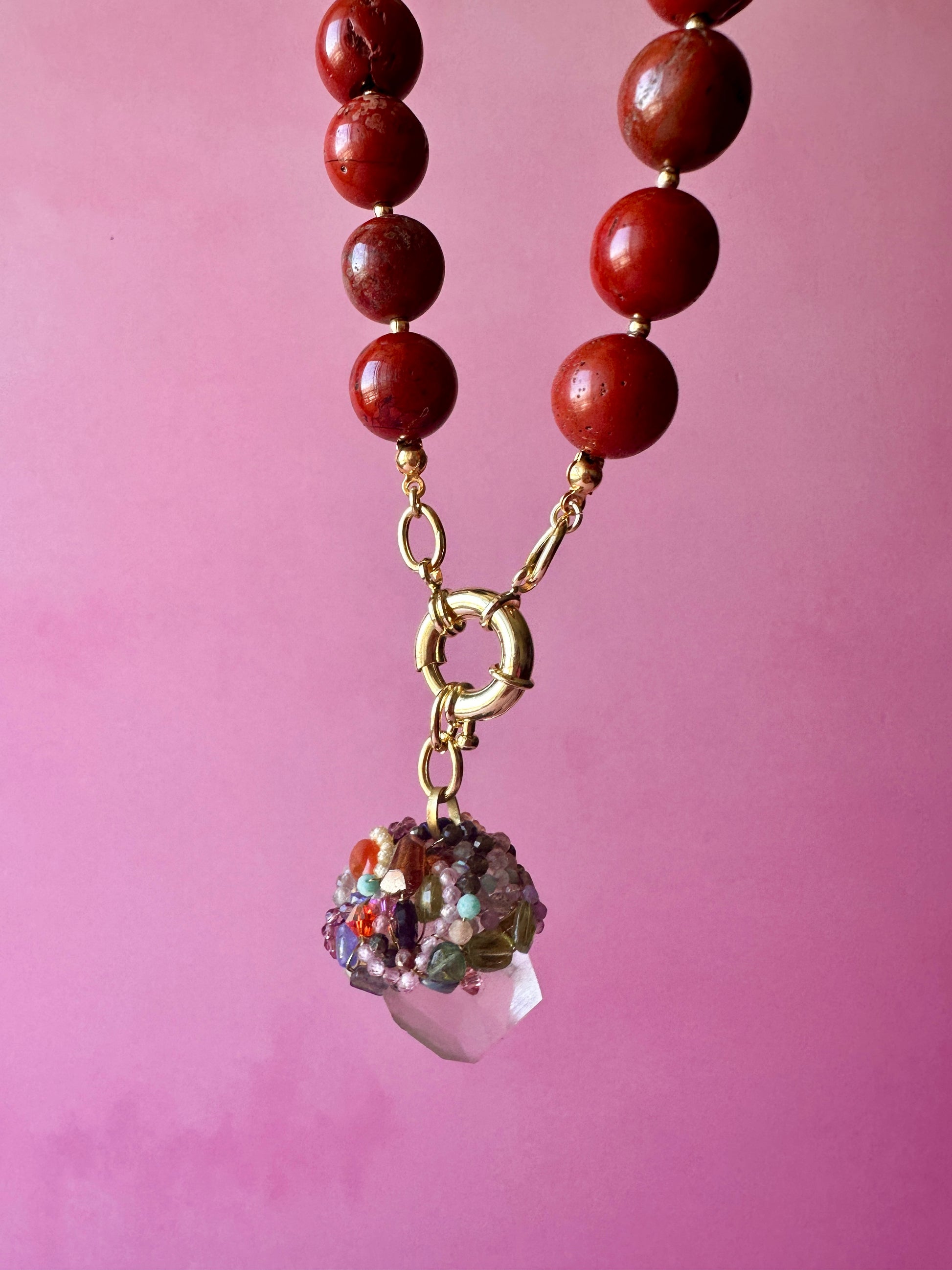 Talismán Creación, un collar poderoso diseñado para acompañar en procesos de inspiración, nuevos proyectos y ciclos de transformación. Su diseño destaca un mágico Cuarzo en bruto, complementado por cuentas de Jaspe Rojo que potencian la energía y la magia del Cuarzo.
