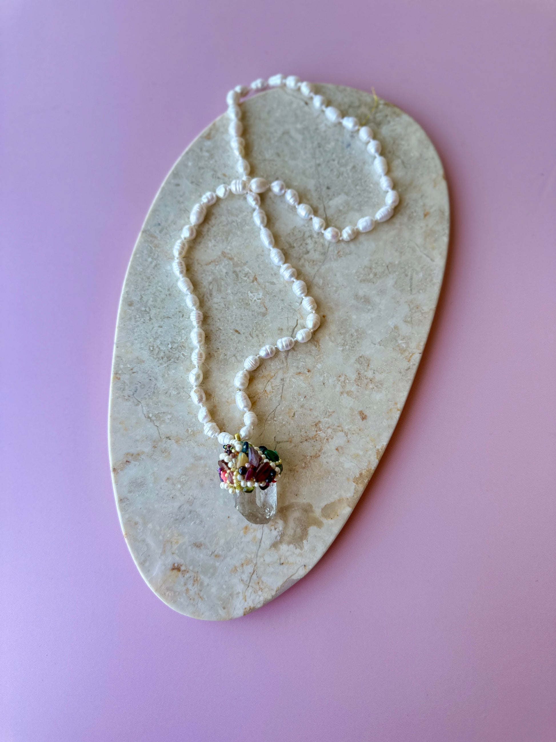 Talismán Creación en Bruto, un collar con un mágico y poderoso Cuarzo en bruto, decorado con una corona de piedras semipreciosas con cortes biselares y microfacetado. Este accesorio se transforma en un verdadero aliado energético, acompañándote, cuidándote y ayudando en procesos de sanación, ya que los Cuarzos en bruto poseen poderosas propiedades protectoras. Este talismán fue intencionado para ayudarte a crear nuevos ciclos, ya sea en el plano físico o energético. Incluye un cordón de Perlas de Río de 66 cm de longitud, sin metales ni broche.